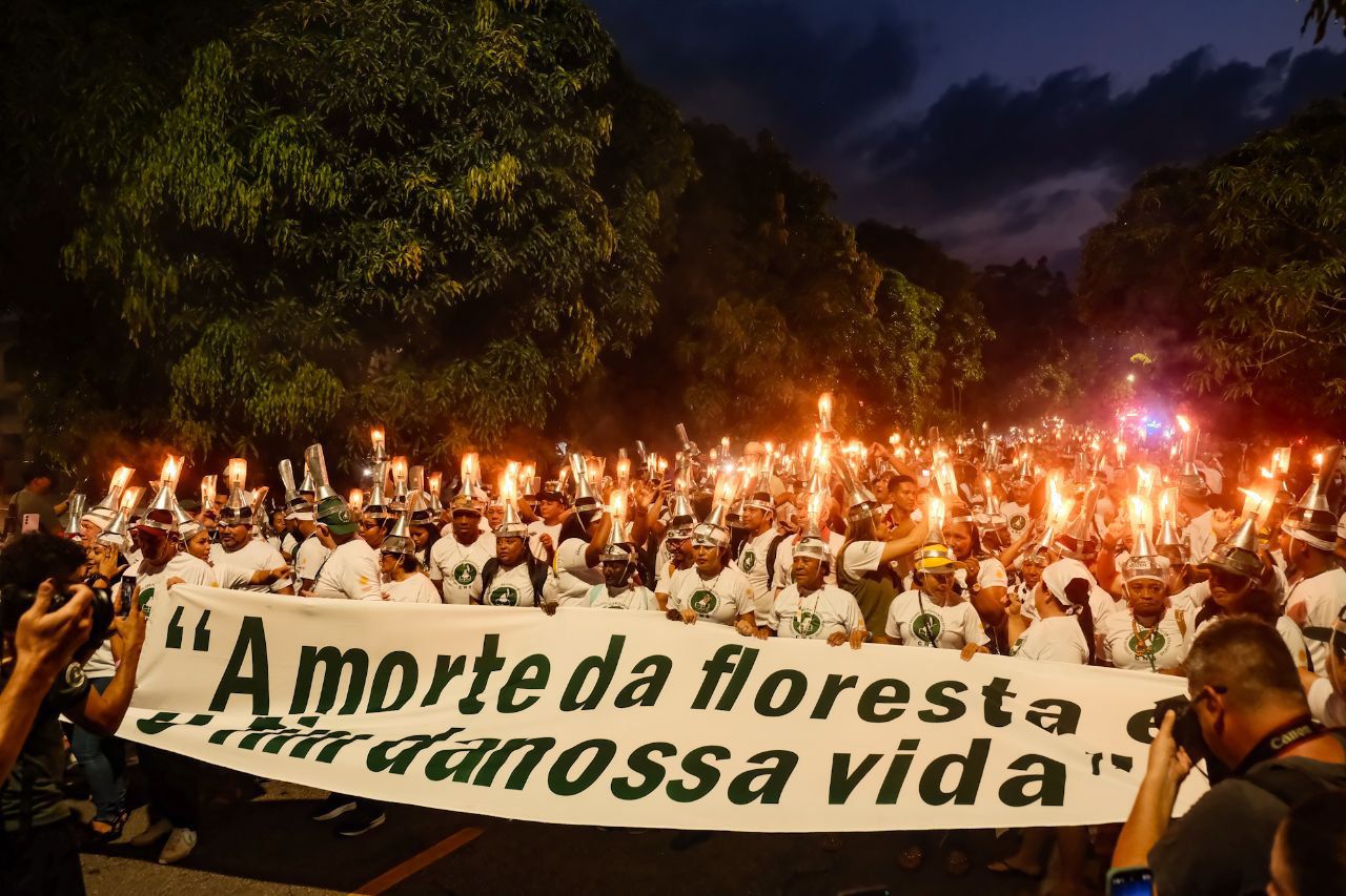 Após ocuparem as ruas de Belém (PA) com uma “poranga” na cabeça e um pavio em chamas, símbolo do seringueiro, mais de mil pessoas de diversos biomas do país entregaram a “Carta das Populações Tradicionais Extrativistas” às ministras do Meio Ambiente e Mudança do Clima, Marina Silva, e dos Povos